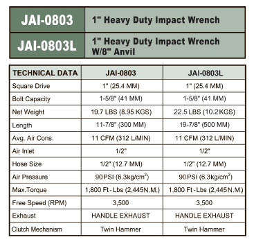 JAI0803 / 1" SQ. HEAVY DUTY IMPACT WENCH TWIN HAMMER, PISTOL TYPE