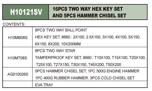 H10121SV / 16 PCS TWO WAY HEX KEY SET T20 - T50 & 5PCS HAMMER CHISEL SET